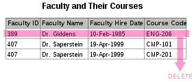 Under certain circumstances, the deletion of data representing certain facts necessitates the deletion of data representing completely different facts. The "Faculty and Their Courses" relation described in the previous example suffers from this type of anomaly, for if a faculty member temporarily ceases to be assigned to any courses, the last of the records on which that faculty member appears must be deleted, effectively also deleting the faculty member, unless the Course Code field is set to null.