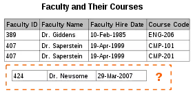 There are circumstances in which certain facts cannot be recorded at all. For example, each record in a "Faculty and Their Courses" relation might contain a Faculty ID, Faculty Name, Faculty Hire Date, and Course Code. Therefore, the details of any faculty member who teaches at least one course can be recorded, but a newly hired faculty member who has not yet been assigned to teach any courses cannot be recorded, except by setting the Course Code to null.
