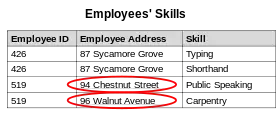 The same information can be expressed on multiple rows; therefore updates to the relation may result in logical inconsistencies. For example, each record in an "Employees' Skills" relation might contain an Employee ID, Employee Address, and Skill; thus a change of address for a particular employee may need to be applied to multiple records (one for each skill). If the update is only partially successful – the employee's address is updated on some records but not others – then the relation is left in an inconsistent state. Specifically, the relation provides conflicting answers to the question of what this particular employee's address is.