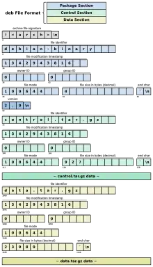 control.tarcontains the maintainer scripts and the package meta-information (package name, version, dependencies and maintainer). Compressing the archive with gzip or xz and zstd is supported. The file extension changes to indicate the compression method.[9][2] - data archive - A tar archive named
