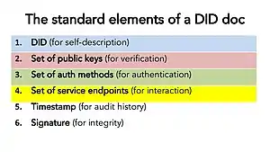 A DID identifies any subject (e.g., a person, organization, thing, data model, abstract entity, etc.) that the controller of the DID decides that it identifies. DIDs are designed to enable the controller of a DID to prove control over it and to be implemented independently of any centralized registry, identity provider, or certificate authority. DIDs are URIs that associate a DID subject with a DID document.[4] Each DID document can express cryptographic material, verification methods, and service endpoints to enable trusted interactions associated with the DID subject. A DID document might contain additional semantics about the subject that it identifies. A DID document might also contain the DID subject itself (e.g. a data model).[5][1] National efforts include the European Digital Identity (EUDI) Wallet as a part of eIDAS 2.0 in the European Union,[6] and China Real-Name Decentralized Identifier System (China RealDID) under China's Ministry of Public Security.[7]