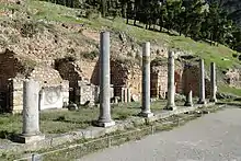 The ancient theatre at Delphi was built farther up the hill from the Temple of Apollo giving spectators a view of the entire sanctuary and the valley below.[23] It was originally built in the fourth century BC, but was remodeled on several occasions, particularly in 160/159 B.C. at the expenses of king Eumenes II of Pergamon and, in 67 A.D., on the occasion of emperor Nero's visit.[24]