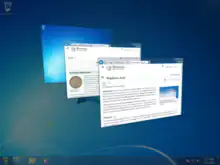 The desktop itself is a full-screen Direct3D surface, with windows being represented as a mesh consisting of two adjacent (and mutually inverted) triangles, which are transformed to represent a 2D rectangle. The texture, representing the UI chrome, is then mapped onto these rectangles. Window transitions are implemented as transformations of the meshes, using shader programs.[3] With Windows Vista, the transitions are limited to the set of built-in shaders that implement the transformations. Greg Schechter, a developer at Microsoft has suggested that this might be opened up for developers and users to plug in their own effects in a future release.[4] DWM only maps the primary desktop object as a 3D surface; other desktop objects, including virtual desktops as well as the secure desktop used by User Account Control are not.[5]