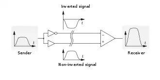 Electrically, the two conductors carry voltage signals which are equal in magnitude, but of opposite polarity. The receiving circuit responds to the difference between the two signals, which results in a signal with a magnitude twice as large.