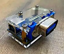 DCB (Digital Control Bus, Digital Connection Bus[1] or Digital Communication Bus[2][3] in some sources) was a proprietary data interchange interface by Roland Corporation, developed in 1981[3] and introduced in 1982 in their Roland Juno-60 and Roland Jupiter-8 products.[3] DCB functions were basically the same as MIDI, but unlike MIDI (which is capable of transmitting a wide array of information), DCB could provide note on/off, program change and VCF/VCA control only. DCB-to-MIDI adapters were produced for a number of early Roland products. The DCB interface was made in 2 variants, the earlier one used 20-pin sockets and cables, later switching to the 14-pin Amphenol DDK connector vaguely resembling a parallel port.