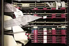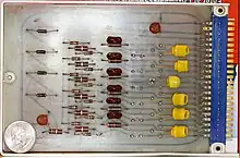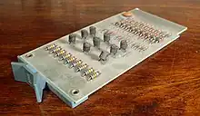 The Laboratory Modules were packaged in an extruded aluminum housing,[12] intended to sit on an engineer's workbench, although a rack-mount bay was sold that held nine laboratory modules.[13] They were then connected together using banana plug patch cords inserted at the front of the modules. Three versions were offered, running at 5 MHz (1957), 500 kHz (1959), or 10 MHz (1960).[11] The Modules proved to be in high demand by other computer companies, who used them to build equipment to test their own systems. Despite the recession of the late 1950s, the company sold $94,000 worth of these modules during 1958 alone (equivalent to $992,700 in 2023), turning a profit at the end of its first year.[9]