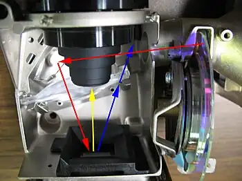 | Interior view of a single-chip DLP projector, showing the light path. Light from the lamp enters a reverse-fisheye, passes through the spinning color wheel, crosses underneath the main lens, reflects off a front-surfaced mirror, and is spread onto the DMD (red arrows). From there, light either enters the lens (yellow) or is reflected off the top cover down into a light-sink (blue arrows) to absorb unneeded light. Top row shows overall components, closeups of 4-segment RGBW color wheel, and light-sink diffuser/reflection plate on top cover. | |||