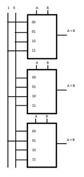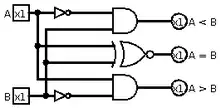A digital comparator or magnitude comparator is a hardware electronic device that takes two numbers as input in binary form and determines whether one number is greater than, less than or equal to the other number. Comparators are used in central processing units (CPUs) and microcontrollers (MCUs). Examples of digital comparator include the CMOS 4063 and 4585 and the TTL 7485 and 74682.
