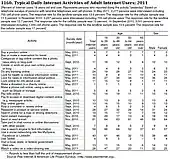 As new applications and software are developed, the Internet has increasingly become utilized to complete a variety of both professional work and personal tasks. To the right of this section are two tables describing the most recent data on the types of activities U.S. citizens utilize the Internet for compiled by the U.S. Census Bureau and presented in its final Statistical Abstract of the United States: 2012.
