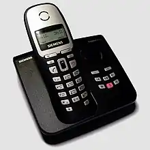 ![]() Gigaset A165 phone with base station. In DECT terminology, the phone is the 'portable part' (PP) and the base station the 'fixed part' (FP) | |
