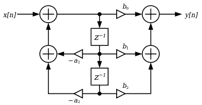 The alternate direct form II only needs N delay units, where N is the order of the filter – potentially half as much as direct form I. This structure is obtained by reversing the order of the numerator and denominator sections of Direct Form I, since they are in fact two linear systems, and the commutativity property applies. Then, one will notice that there are two columns of delays () that tap off the center net, and these can be combined since they are redundant, yielding the implementation as shown below.
