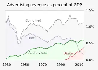The number of marketing channels continues to expand, as measurement practices are growing in complexity. A cross-platform view must be used to unify audience measurement and media planning. Market researchers need to understand how the Omni-channel affects consumer's behavior, although when advertisements are on a consumer's device this does not get measured. Significant aspects to cross-platform measurement involve deduplication and understanding that you have reached an incremental level with another platform, rather than delivering more impressions against people that have previously been reached.[61] An example is ‘ESPN and comScore partnered on Project Blueprint discovering the sports broadcaster achieved a 21% increase in unduplicated daily reach thanks to digital advertising’.[61] Television and radio industries are the electronic media, which competes with digital and other technological advertising. Yet television advertising is not directly competing with online digital advertising due to being able to cross platform with digital technology. Radio also gains power through cross platforms, in online streaming content. Television and radio continue to persuade and affect the audience, across multiple platforms.[63]