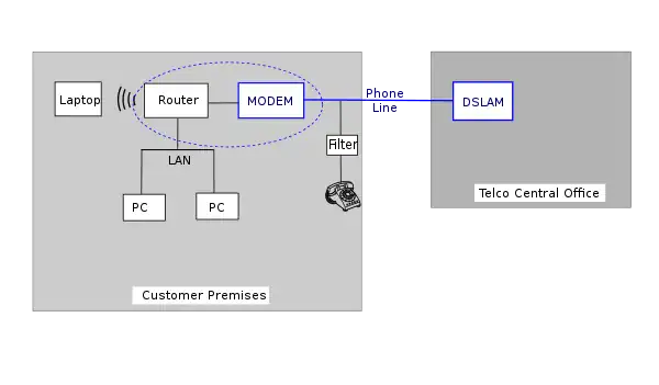 The above figure is a schematic of a simple DSL connection (in blue). The right side shows a DSLAM residing in the telephone company's telephone exchange. The left side shows the customer premises equipment with an optional router. The router manages a local area network which connects PCs and other local devices. The customer may opt for a modem that contains both a router and wireless access. This option (within the dashed bubble) often simplifies the connection.