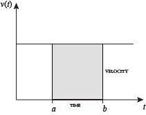 When velocity is constant, the total distance traveled over the given time interval can be computed by multiplying velocity and time. For example, travelling a steady 50 mph for 3 hours results in a total distance of 150 miles. In the diagram on the left, when constant velocity and time are graphed, these two values form a rectangle with height equal to the velocity and width equal to the time elapsed. Therefore, the product of velocity and time also calculates the rectangular area under the (constant) velocity curve. This connection between the area under a curve and distance traveled can be extended to any irregularly shaped region exhibiting an incrementally varying velocity over a given time period. If the bars in the diagram on the right represents speed as it varies from an interval to the next, the distance traveled (between the times represented by and ) is the area of the shaded region .