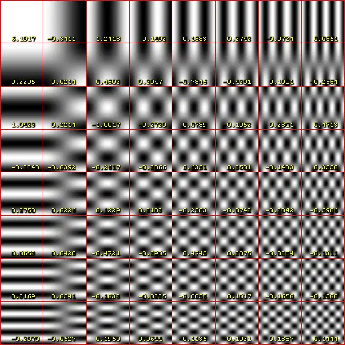 The DCT-II is an important image compression technique. It is used in image compression standards such as JPEG, and video compression standards such as H.26x, MJPEG, MPEG, DV, Theora and Daala. There, the two-dimensional DCT-II of blocks are computed and the results are quantized and entropy coded. In this case, is typically 8 and the DCT-II formula is applied to each row and column of the block. The result is an 8 × 8 transform coefficient array in which the element (top-left) is the DC (zero-frequency) component and entries with increasing vertical and horizontal index values represent higher vertical and horizontal spatial frequencies.