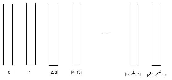 We create some buckets and put vertices into the buckets according to their ranks inductively. That is, vertices with rank 0 go into the zeroth bucket, vertices with rank 1 go into the first bucket, vertices with ranks 2 and 3 go into the second bucket. If the B-th bucket contains vertices with ranks from interval then the (B+1)st bucket will contain vertices with ranks from interval