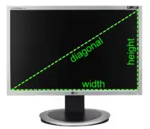 The size of a screen is usually described by the length of its diagonal, which is the distance between opposite corners, usually in inches. It is also sometimes called the physical image size to distinguish it from the "logical image size," which describes a screen's display resolution and is measured in pixels.