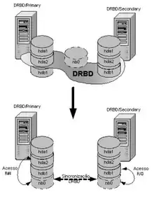 Distributed Replicated Block Device (DRBD) is a distributed replicated storage system for the Linux platform. It is implemented as a kernel driver, several userspace management applications, and some shell scripts. DRBD is traditionally used in high availability (HA) computer clusters, but beginning with DRBD version 9, it can also be used to create larger software defined storage pools with a focus on cloud integration.[3]