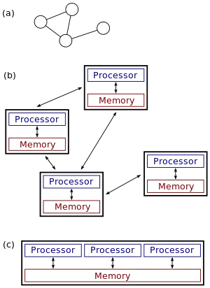 The figure on the right illustrates the difference between distributed and parallel systems. Figure (a) is a schematic view of a typical distributed system; the system is represented as a network topology in which each node is a computer and each line connecting the nodes is a communication link. Figure (b) shows the same distributed system in more detail: each computer has its own local memory, and information can be exchanged only by passing messages from one node to another by using the available communication links. Figure (c) shows a parallel system in which each processor has a direct access to a shared memory.