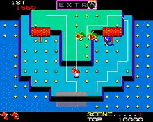 Players are additionally encouraged to inscribe sections of the playfield by the letters E, X, T, R, A, a constant feature of the Mr. Do! games. Randomly, one of the inscribed fruits will turn into a flashing letter spot, corresponding with the movement of the Alpha-Monster at the top of the screen. If Mr. Do! runs over this spot, the monster sporting that letter will release from the top of the screen with three blue henchmen (which resemble the three ghost-like monsters from the original Mr. Do!), and chase after Mr. Do. Defeating the Alpha-monster will lock in that letter, and once all 5 letters are earned, the player earns an extra life (as well as progressing to the next stage, you also earn a 5,000 point bonus).