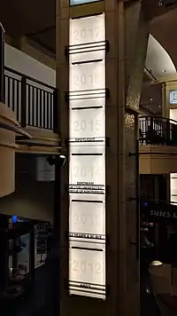 The hall from the front entrance to the grand stairway (leading up to the theater at the rear of the shopping complex) is flanked by storefronts, as well as Art Deco columns displaying the names of past recipients of the Academy Award for Best Picture (with blank spaces left for future Best Picture winners, currently set up to 2071). In a fashion reminiscent of Hollywood movie-making, the building is dressed before the Academy Awards ceremony, sometimes with a different sign on its façade, red drapery to hide its storefronts, and the famous red carpet running up its grand stairway.