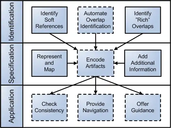 The goal of the identification step is to identify language overlaps. As described in the example, an overlap is an area where the concerns of two languages intersect. The soft references from Form DSL to Service DSL and from Service DSL to Entity DSL in the create survey use case are examples of such overlaps. Another example is the case where a customized code snippet is used to extend a model. Such overlaps are frequent when the expressiveness of general-purpose languages is needed to implement specialized requirements that are beyond the scope of the model. The identification step can either be a manual or an automatic process depending on the complexity of the overlaps. When the overlaps have been identified and made explicit, this information is used as input to the second step in the method: the specification step.