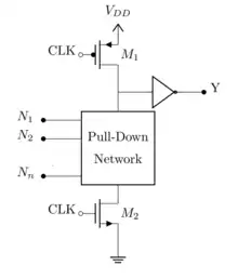 Dynamic logic differs from static logic by including a clock signal to speed up performance. In CMOS dynamic logic gates, the gate output is precharged to the power supply voltage while the clock is off (the "precharge" phase), and then is evaluated to the correct logic state while the clock is on (the "evaluation" phase) by draining the relevant NMOS transistors in the pull-down network.[2]