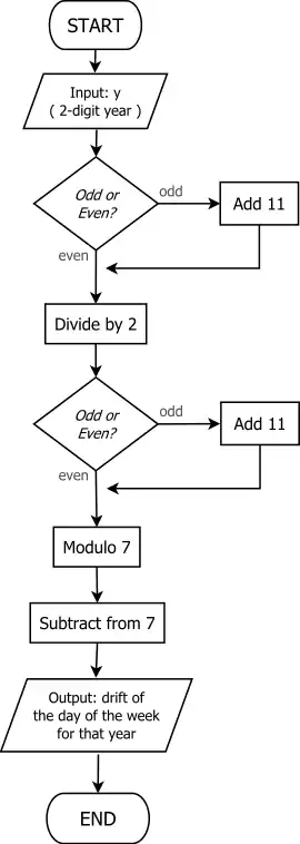 Each ordinary year has its Doomsday 1 day later than the previous year, and each leap year 2 days later. It follows that within any given century a dozen years advances Doomsday by 12 + 3 = 15 days = 1 day. ('A dozen years is but a day.') So we add to the Doomsday for the century year the number of dozens of years thereafter, the remainder, and the number of fours in the remainder.