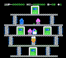 An expanded version of the game, branded Door Door mkII, was released two years after the original in February 1985. The game was ported to MSX computers, NEC's PC-6001, PC-6001mkII, PC-6601, PC-8801, PC-8801mkII, and PC-8801mkIISR models, Sharp's MZ-2000, and Fujitsu's FM-7. It features 100 levels and the option to start the game from the new set of levels (beginning with level 51). Encouraged by the rapidly increasing popularity of video game consoles in Japan, Enix also ported Door Door to Nintendo's Famicom. In March 2004, Chunsoft celebrated their 20th anniversary by releasing a version of Door Door for Japanese mobile phone networks. A faithful reproduction of the Famicom version, the application is available for the NTT DoCoMo FOMA 505i and 900i series phones, and can be downloaded from i-chunsoft for ¥300 per month.[9] To the right is a table of all licensed ports of Door Door. A modified version featuring Mean Clean (エコ吉, eco kichi in Japanese) as the main protagonist is also featured in the 2008 visual novel 428: Shibuya Scramble as an unlockable bonus.