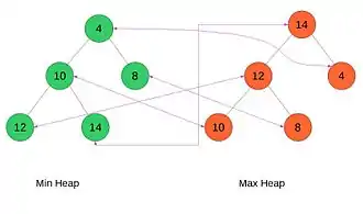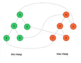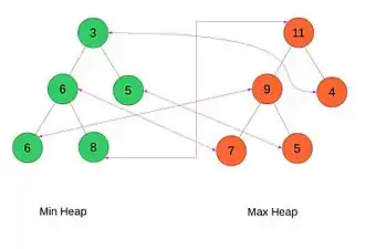 - Removing the max element: Perform removemax() on the max heap and remove(node value) on the min heap, where node value is the value in the corresponding node in the min heap.