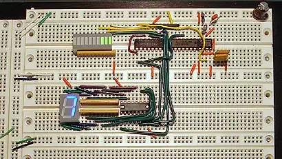 DIPs are also used with breadboards, a temporary mounting arrangement for education, design development or device testing. Some hobbyists, for one-off construction or permanent prototyping, use point-to-point wiring with DIPs, and their appearance when physically inverted as part of this method inspires the informal term "dead bug style" for the method.