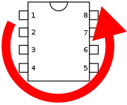 For example, for a 14-lead DIP, with the notch at the top, the left leads are numbered from 1 to 7 (top to bottom) and the right row of leads are numbered 8 to 14 (bottom to top).