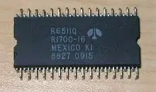 In microelectronics, a dual in-line package (DIP or DIL)[1] is an electronic component package with a rectangular housing and two parallel rows of electrical connecting pins. The package may be through-hole mounted to a printed circuit board (PCB) or inserted in a socket. The dual-inline format was invented by Don Forbes, Rex Rice and Bryant Rogers at Fairchild R&D in 1964,[2] when the restricted number of leads available on circular transistor-style packages became a limitation in the use of integrated circuits.[3] Increasingly complex circuits required more signal and power supply leads (as observed in Rent's rule); eventually microprocessors and similar complex devices required more leads than could be put on a DIP package, leading to development of higher-density chip carriers. Furthermore, square and rectangular packages made it easier to route printed-circuit traces beneath the packages.