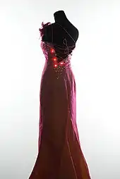 In 1968, the Museum of Contemporary Craft in New York City held a ground-breaking exhibition called Body Covering that focused on the relationship between technology and apparel. The show featured astronauts' space suits along with clothing that could inflate and deflate, light up, and heat and cool itself.[7] Particularly noteworthy in this collection was the work of Diana Dew,[8] a designer who created a line of electronic fashion, including electroluminescent party dresses and belts that could sound alarm sirens.[9]