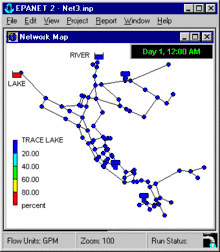 EPANET's water quality modeling functionality allows users to analyze the movement of a reactive or non-reactive tracer material which spreads through the network over time. It tracks the reactive material as it spreads, measuring the percentage of flow from the given nodes. The package employs the global reaction rate coefficient which can be modified on a pipe-by-pipe basis. The storage tanks can be modeled as complete mix, plug flow or two-compartment reactors.