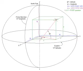 As with any spatial reference system, ECEF consists of an abstract coordinate system (in this case, a conventional three-dimensional right-handed system), and a geodetic datum that binds the coordinate system to actual locations on the Earth.[4] The ECEF that is used for the Global Positioning System (GPS) is the geocentric WGS 84, which currently includes its own ellipsoid definition.[5] Other local datums such as NAD 83 may also be used. Due to differences between datums, the ECEF coordinates for a location will be different for different datums, although the differences between most modern datums is relatively small, within a few meters.