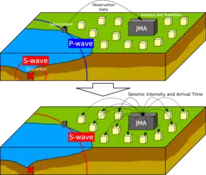 The JMA has two EEW systems: one for the general public and another for the National Meteorological and Hydrological Services.[7][8] When a P-wave is detected from two (or more) of the 4,235 seismometers installed throughout Japan, the JMA analyzes and predicts the approximate location of the earthquake's epicenter. This allows the JMA to notify people in affected prefectures by TV and radio if a strong earthquake is expected.[8]