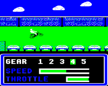 The player starts by riding away from the jump to get a big enough run up. They then must set the correct speed, correctly selecting gears, to hit the ramp with enough speed to clear the obstacles but not too much to miss the landing ramp. While in the air, the player can lean forward or back to land correctly.