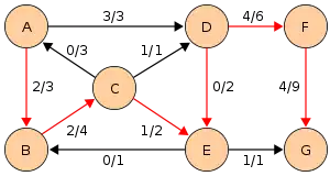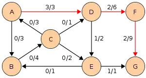 | Failed to parse (SVG (MathML can be enabled via browser plugin): Invalid response ("Math extension cannot connect to Restbase.") from server "http://localhost:6011/en.wikipedia.org/v1/":): {\displaystyle \begin{align} & \min(c_f(A,D),c_f(D,F),c_f(F,G)) \\ = & \min(3-1,6-0,9-0) \\ = & \min(2,6,9) = 2 \end{align}} | Failed to parse (SVG (MathML can be enabled via browser plugin): Invalid response ("Math extension cannot connect to Restbase.") from server "http://localhost:6011/en.wikipedia.org/v1/":): {\displaystyle A,D,F,G} | ![]() |