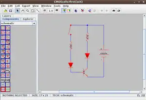 The Electric VLSI Design System is an EDA tool written in the early 1980s by Steven M. Rubin.[3][4][5] Electric is used to construct logic wire schematics and to perform analysis of integrated circuit layout. It can also handle hardware description languages such as VHDL and Verilog. The system has many analysis and synthesis tools, including design rule checking, simulation, routing, Layout vs. Schematic, logical effort, and more.