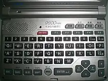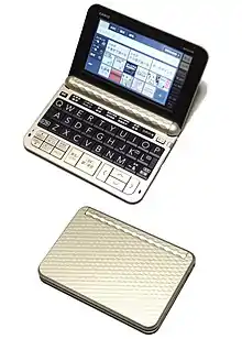 Handheld electronic dictionaries, also known as "pocket electronic dictionaries" or PEDs, resemble miniature clamshell laptop computers, complete with full keyboards and LCD screens. Because they are intended to be fully portable, the dictionaries are battery-powered and made with durable casing material. Although produced all over the world, handheld dictionaries are especially popular in Japan, Korea, Taiwan, China, and neighbouring countries, where they are the dictionary of choice for many users learning English as a second language.[5] Some features of handheld dictionaries include stroke order animations, voice output, handwriting recognition, language-learning programs, a calculator, PDA-like organizer functions, time zone and currency converters, and crossword puzzle solvers. Dictionaries that contain data for several languages may have a "jump" or "skip-search" feature that allows users to move between the dictionaries when looking up words, and a reverse translation action that allows further look-ups of words displayed in the results. Many manufacturers produce handheld dictionaries that use licensed dictionary content[6] that use a database such as the Merriam Webster Dictionary and Thesaurus while others may use a proprietary database from their own lexicographers.[7] Users can also add content to their handheld dictionaries with memory cards (both expandable and dedicated), CD-ROM data, and Internet downloads. Manufacturers include AlfaLink, Atree, Besta, Casio, Canon, Instant Dict, Ectaco, Franklin, Iriver, Lingo, Maliang Cyber Technology, Compagnia Lingua Ltd., Nurian, Seiko, and Sharp.