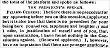 The transcript of one of Abraham Lincoln's speeches in 1862 recorded the audience's reaction as: "(applause and laughter ;)".[10][15] There has been some debate whether the glyph in Lincoln's speech was a typo, a legitimate punctuation construct, or the first emoticon.[16] Linguist Philip Seargeant argues that it was a simple typesetting error.[17]
