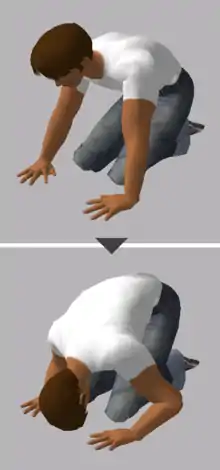 Orz (other forms include: Or2, on_, OTZ, OTL, STO, JTO,[57] _no, _冂○,[58] 囧rz,[56]) is an emoticon representing a kneeling or bowing person (the Japanese version of which is called dogeza) with the "o" being the head, the "r" being the arms and part of the body, and the "z" being part of the body and the legs. This stick figure can represent respect or kowtowing, but commonly appears along a range of responses, including "frustration, despair, sarcasm, or grudging respect".[59]