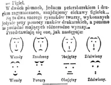 Before March 1881 the examples of "typographical art" appeared in at least three newspaper articles, including Kurjer warszawski (published in Warsaw) from March 5, 1881, using punctuation to represent the emotions of joy, melancholy, indifference, and astonishment.[18]