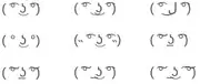 In South Korea, emoticons use Korean Hangul letters, and the Western style is rarely used.[55] The structures of Korean and Japanese emoticons are somewhat similar, but they have some differences. Korean style contains Korean jamo (letters) instead of other characters. There are countless number of emoticons that can be formed with such combinations of Korean jamo letters. Consonant jamos ㅅ, ㅁ or ㅂ as the mouth/nose component and ㅇ, ㅎ or ㅍ for the eyes. For example: ㅇㅅㅇ, ㅇㅂㅇ, ㅇㅁㅇ and -ㅅ-. Faces such as 'ㅅ', "ㅅ", 'ㅂ' and 'ㅇ', using quotation marks " and apostrophes ' are also commonly used combinations. Vowel jamos such as ㅜ, ㅠ depict a crying face. Example: ㅜㅜ, ㅠㅠ and 뉴뉴 (same function as T in western style). Sometimes ㅡ (not an em-dash "—" but a vowel jamo), a comma or an underscore is added, and the two character sets can be mixed together, as in ㅜ.ㅜ, ㅠ.ㅜ, ㅠ.ㅡ, ㅜ_ㅠ, ㅡ^ㅜ and ㅜㅇㅡ. Also, semicolons and carets are commonly used in Korean emoticons; semicolons mean sweating (embarrassed). If they are used with ㅡ or – they depict a bad feeling. Examples: -;/, --^, ㅡㅡ;;;, -_-;; and -_^. However, ^^, ^오^ means smile (almost all people use this without distinction of sex or age). Others include: ~_~, --a, -6-, +0+.