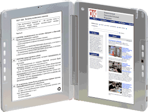 The enTourage eDGe is a dual-touchscreen device that when open looks like a book. One screen is based on e-Ink technology, and the other is a 10.1" polychromatic LCD. Both screens respond to touch, and the interactive use of a stylus. The LCD color screen is designed for multimedia display (an important advantage of the modern educational process), whereas the e-Ink screen is designed for reading and, in the corresponding mode, for taking notes, as though on paper.