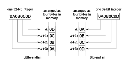 - Increasing numeric significance with increasing memory addresses (or increasing time), known as little-endian.