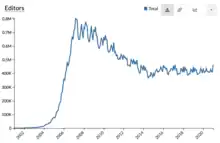 On 1 March 2014, The Economist, in an article titled "The Future of Wikipedia", cited a trend analysis concerning data published by the Wikimedia Foundation stating that "[t]he number of editors for the English-language version has fallen by a third in seven years."[27] The attrition rate for active editors in English Wikipedia was cited by The Economist as substantially in contrast to statistics for Wikipedia in other languages (non-English Wikipedia). The Economist reported that the number of contributors with an average of five or more edits per month was relatively constant since 2008 for Wikipedia in other languages at approximately 42,000 editors within narrow seasonal variances of about 2,000 editors up or down. The number of active editors in English Wikipedia, by "sharp" comparison, was cited as peaking in 2007 at approximately 50,000 and dropping to 30,000 by the start of 2014.