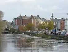 The River Fergus runs through the middle of Ennis and is a well-known trout and salmon fishery. At one time, small sailing boats made their way up river from the Shannon and berthed in the centre of the town at Woodquay.[9] This area of the town along with Parnell Street and Mill Road was routinely susceptible to flooding, but the flood defence system put an end to the event in Parnell Street and the Mill Road areas,[10] although in November 2009 other parts of the town experienced severe flooding.[11] A new pedestrian bridge, Harmony Row Bridge, was built over the river Fergus in June 2009.[12]