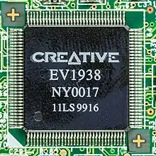 Creative Labs Malvern (which was the former Ensoniq company that had been acquired) later released the Ectiva 1938 (EV1938). This single chip PCI audio controller was based on the ES1371/ES1373 and was register compatible with these previous chips. The main difference between the EV1938 and previous chips was the inclusion of a built-in AC'97 codec (hence producing a cheaper, single chip audio solution). The EV1938 was also used for both integrated audio on laptops/motherboards and on cards, such as the "Sound Blaster AudioPCI 64V" (CT4730).